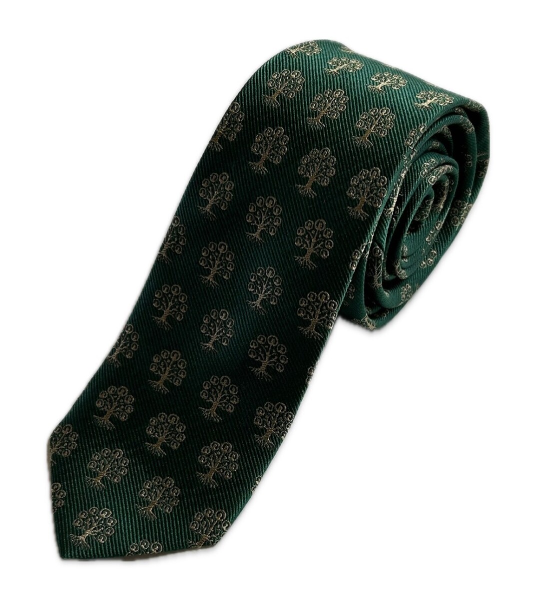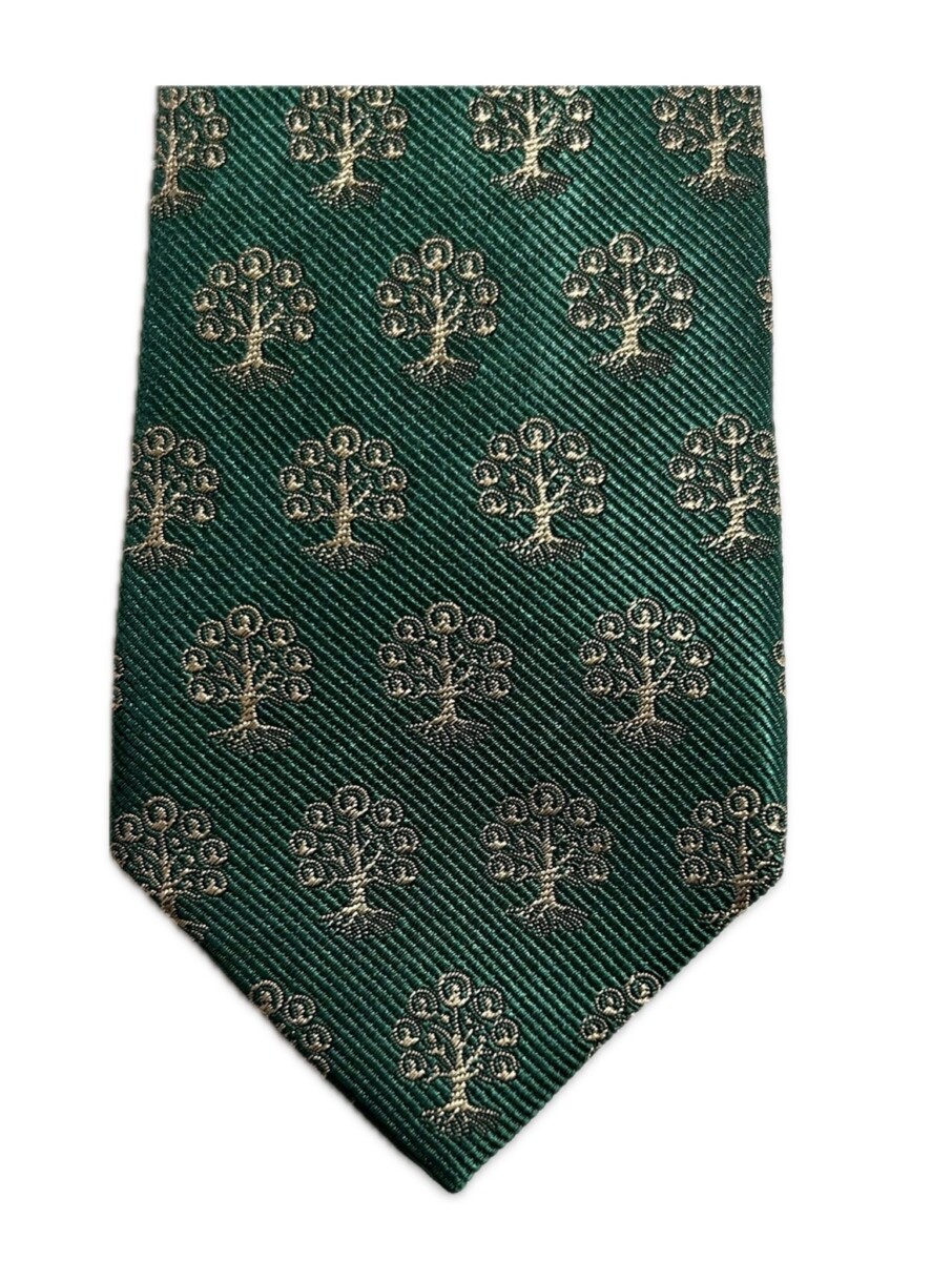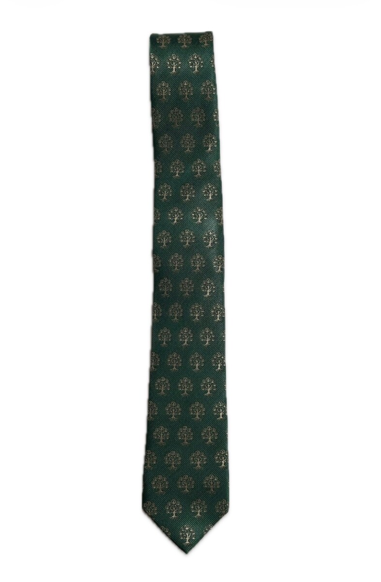 The Family History Skinny Tie is a classic forrest green with gold tree logo.